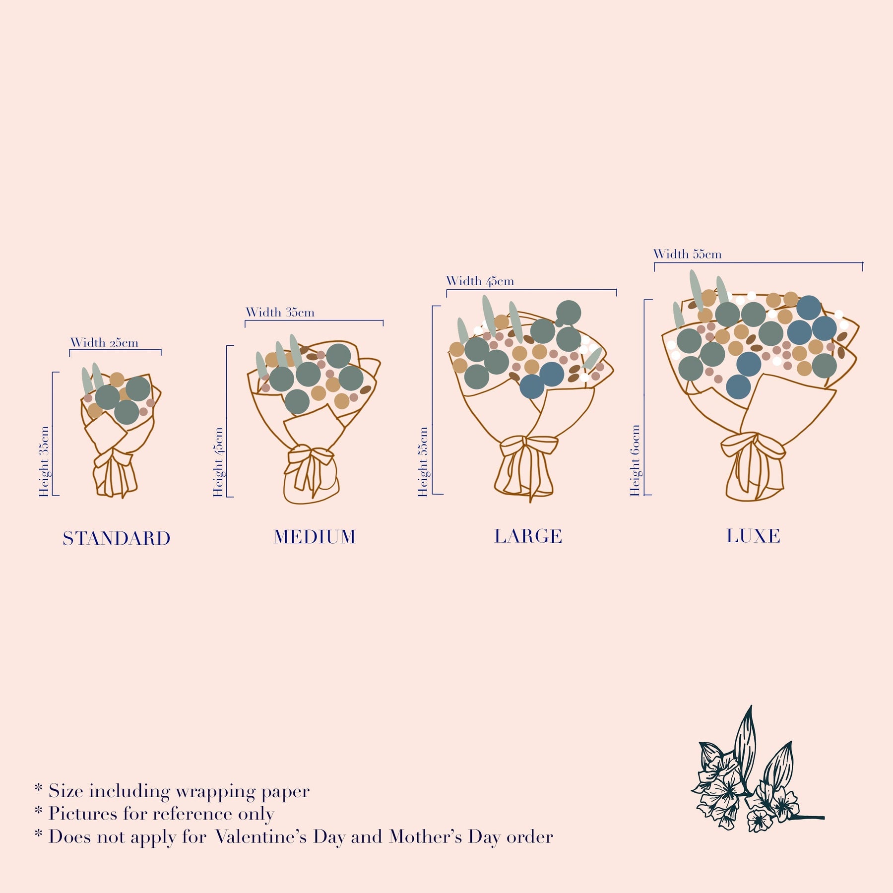 The images shown are an indication of the style. We will craft an arrangement which is similar, using seasonal product. Shown here is Size Luxe. See last image for size reference.
