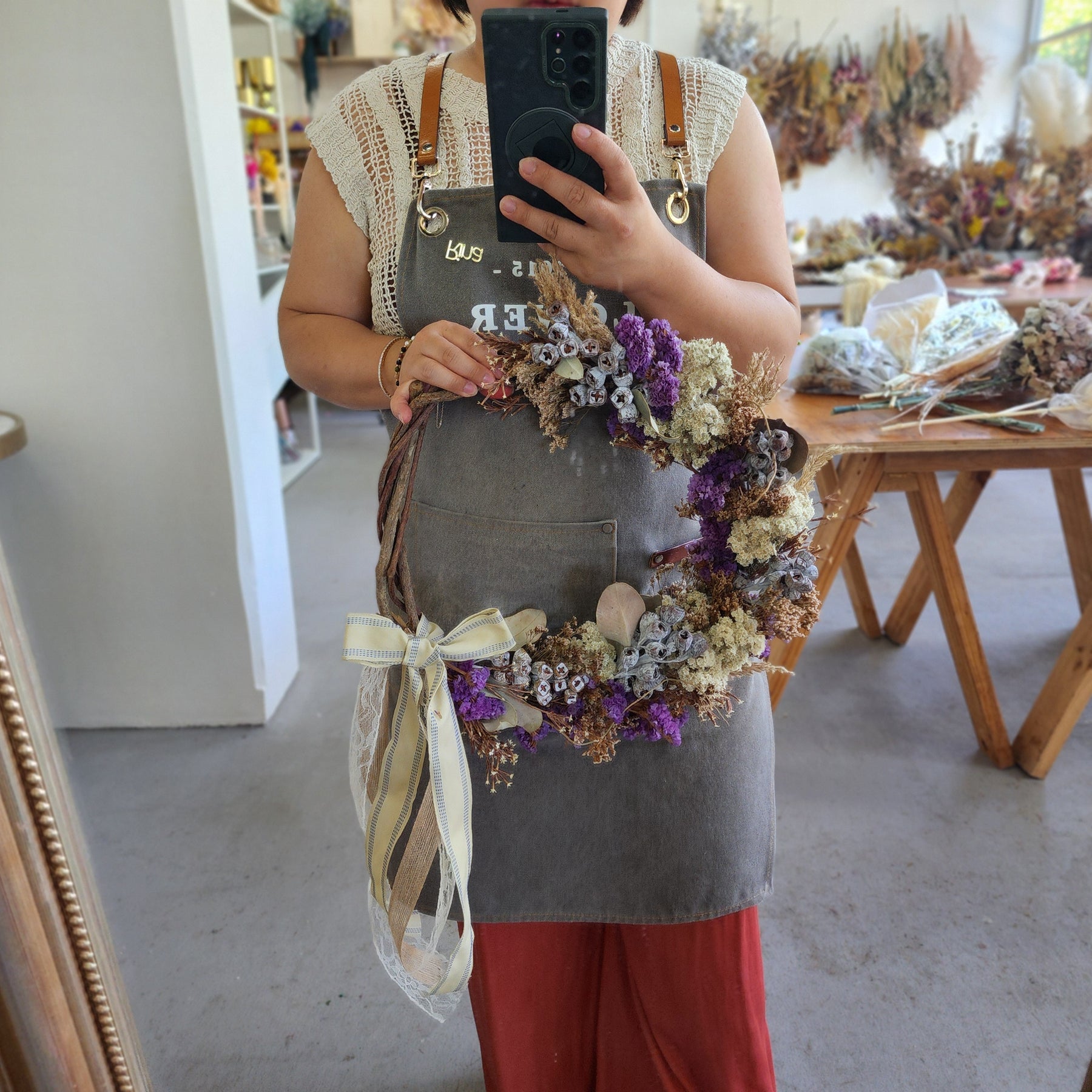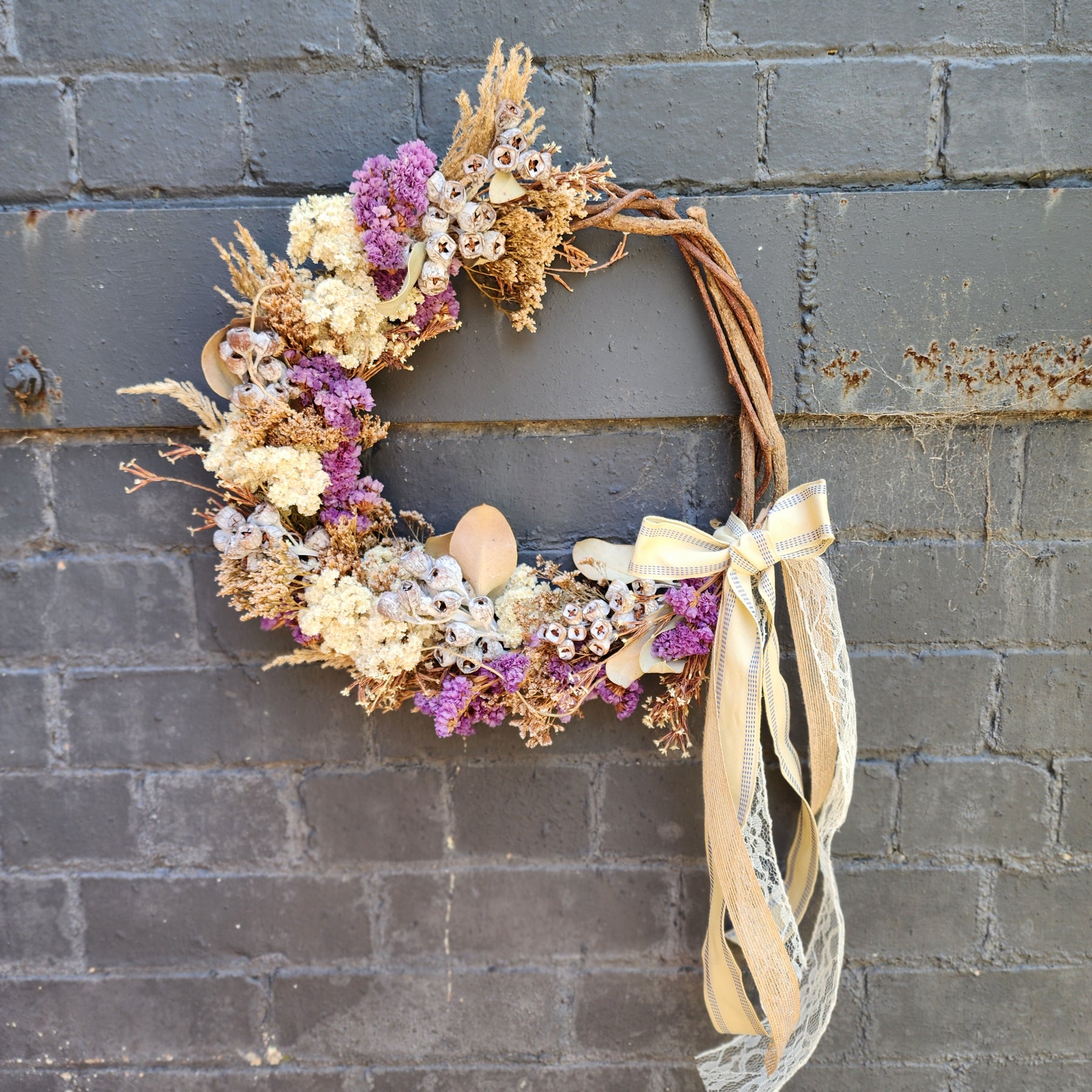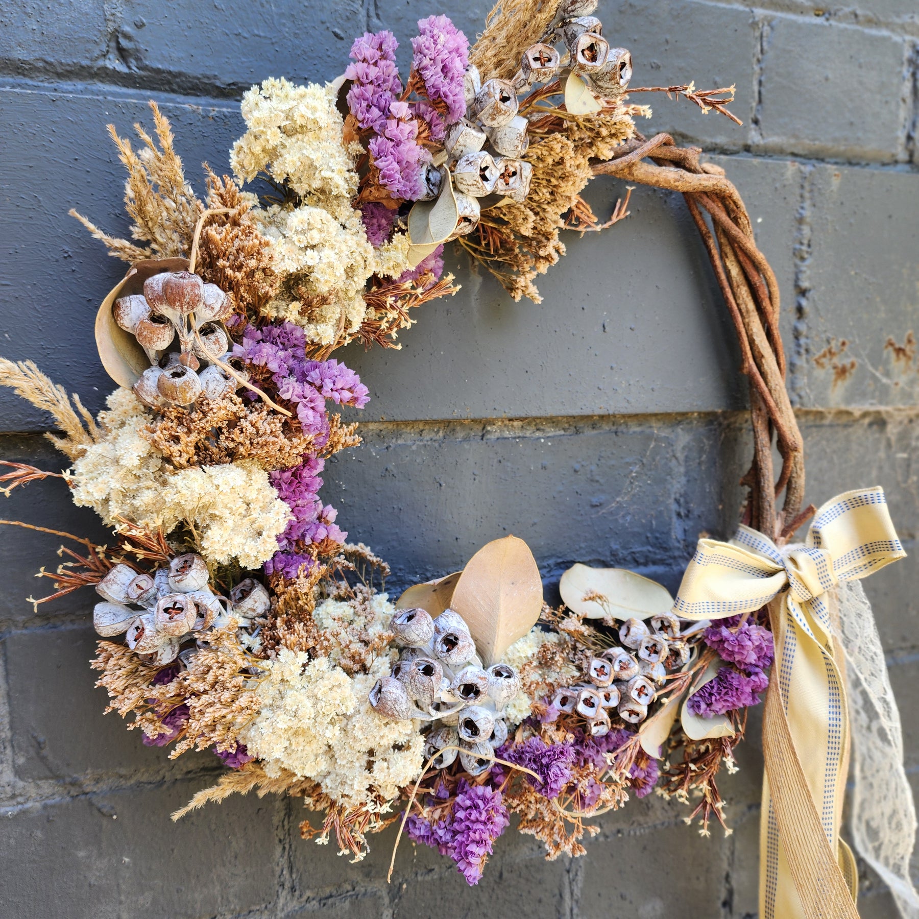 You get what you see. This christmas wreath is made of dried flower in purple, brown and cream shades. overall dimension is approx. 45cm in diameter, measured to the widest point.