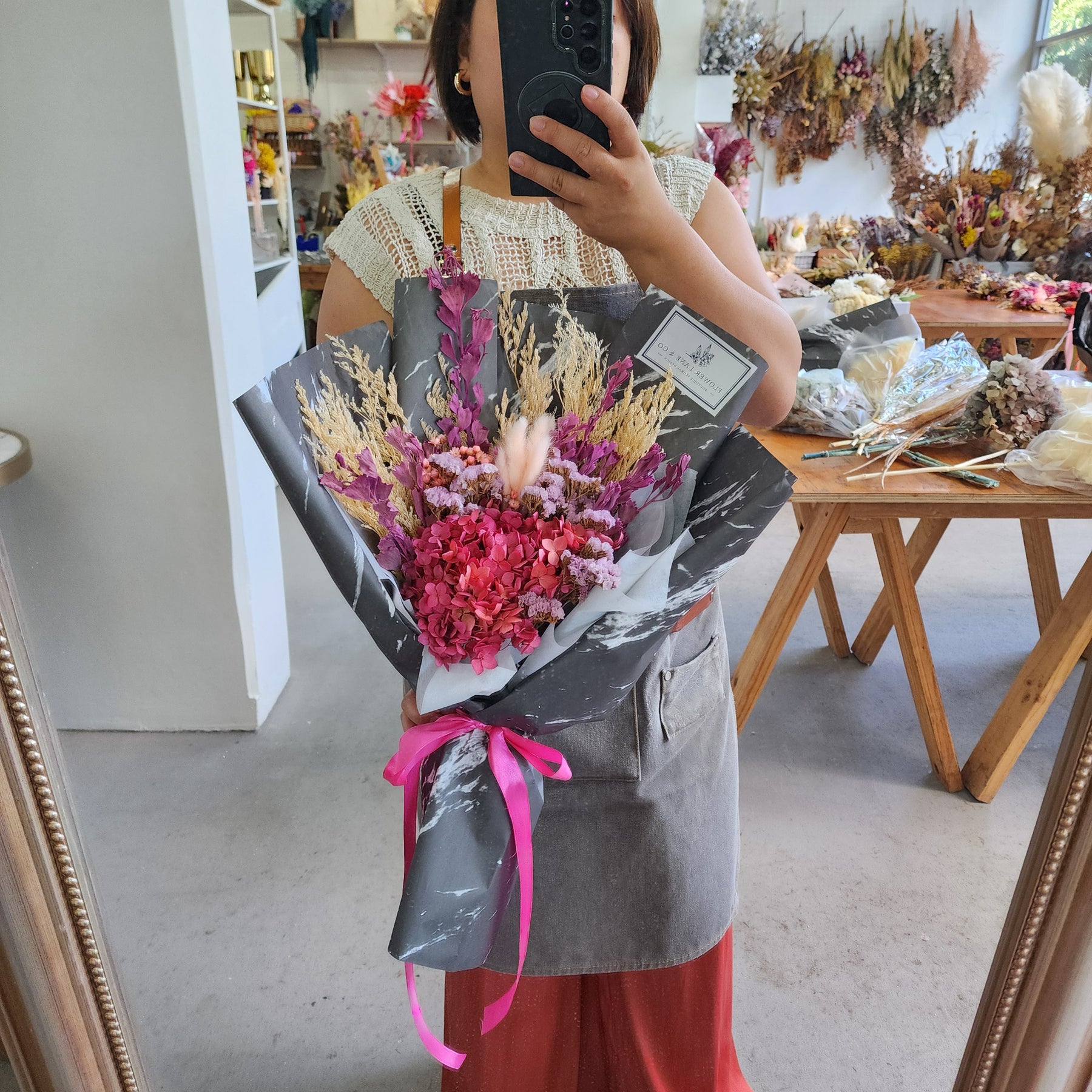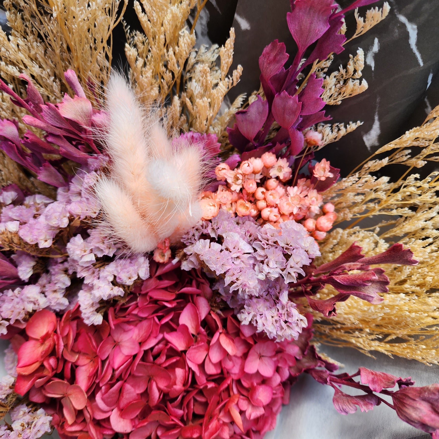 Composed of premium dried and preserved botanicals, this curated arrangement features a harmonious spectrum of deep pink and warm peachy tones. Available in single format as pictured, or upgrade to double sizing for an expanded composition with proportionally increased volume and visual presence.