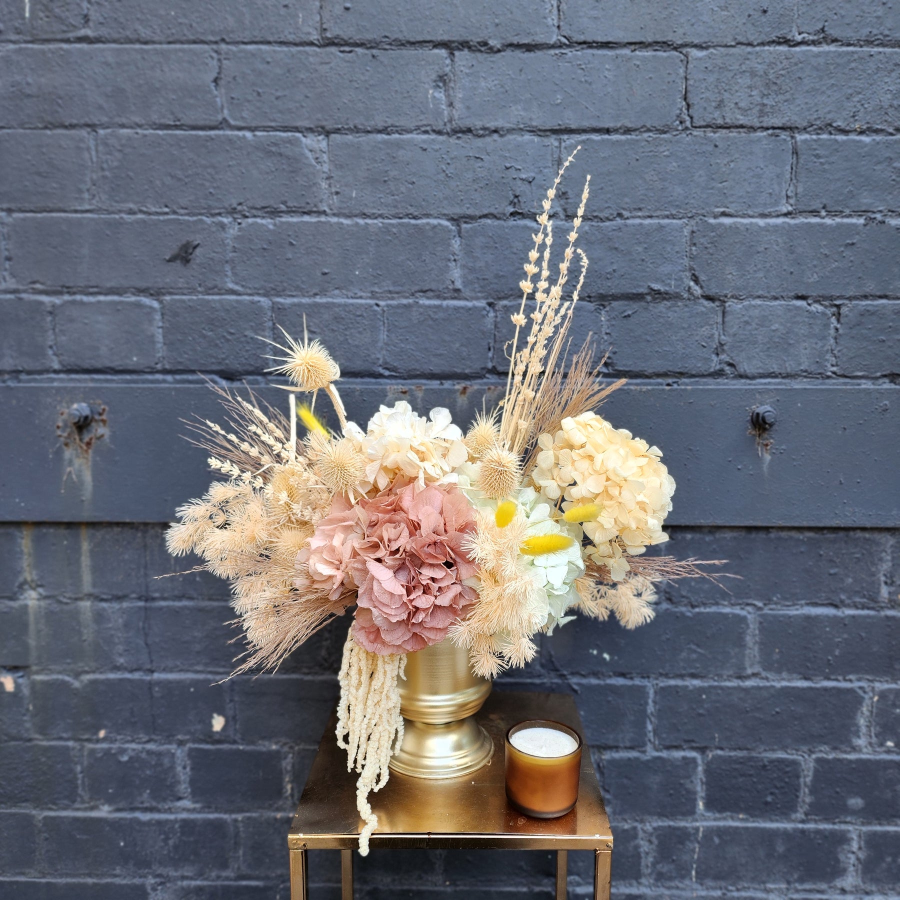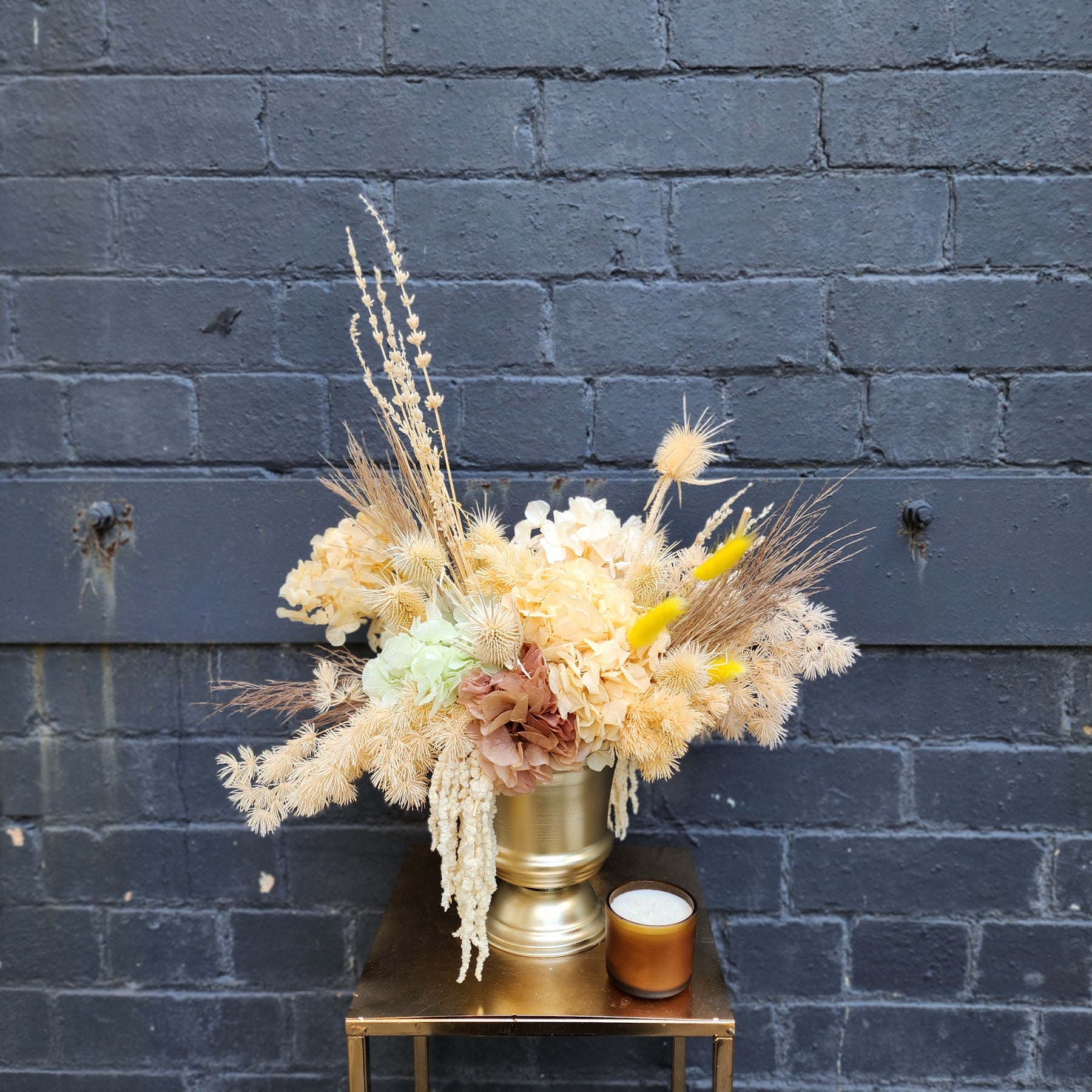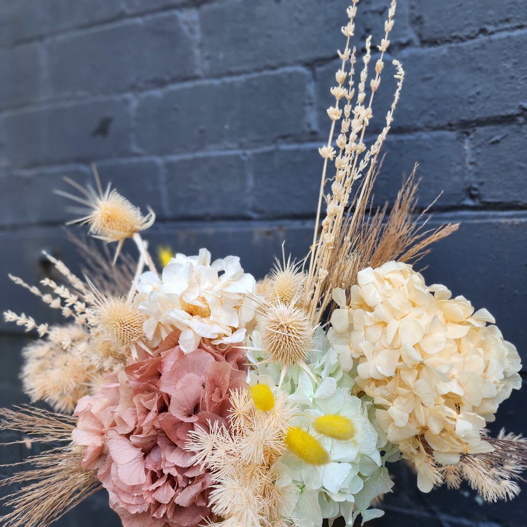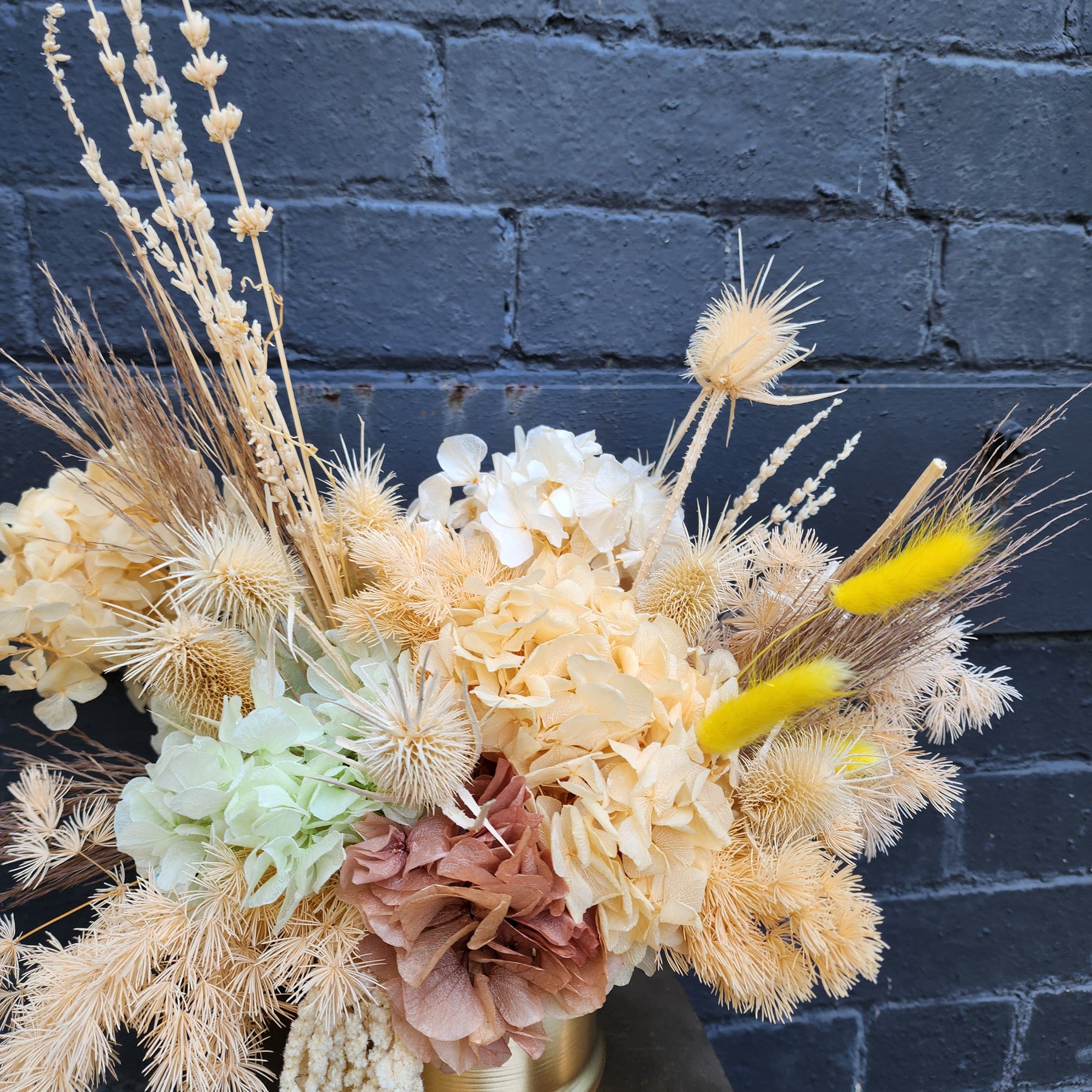 This arrangement is made with dried and preserved flowers in pastel shades. You get what you see. Price inc Vase. Front and back design. Overall dimension is approx. 45cm tall x 50cm wide, measured to the widest/tallest point.