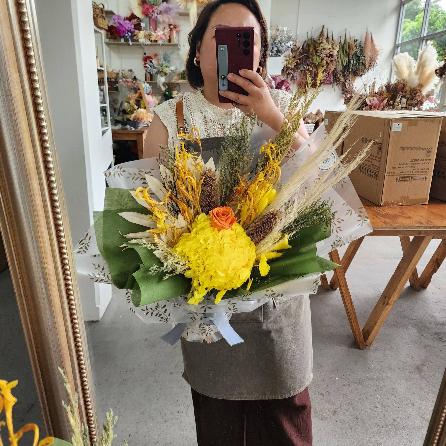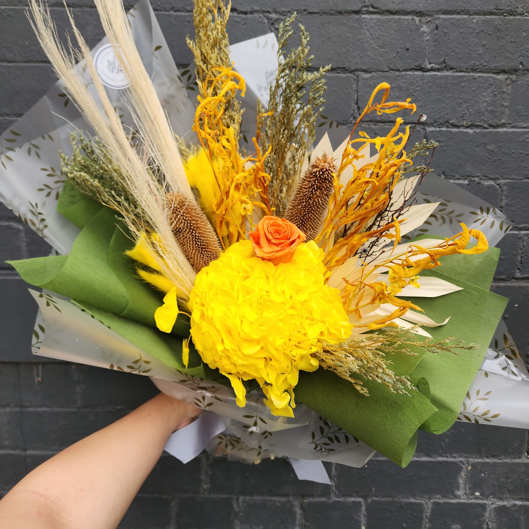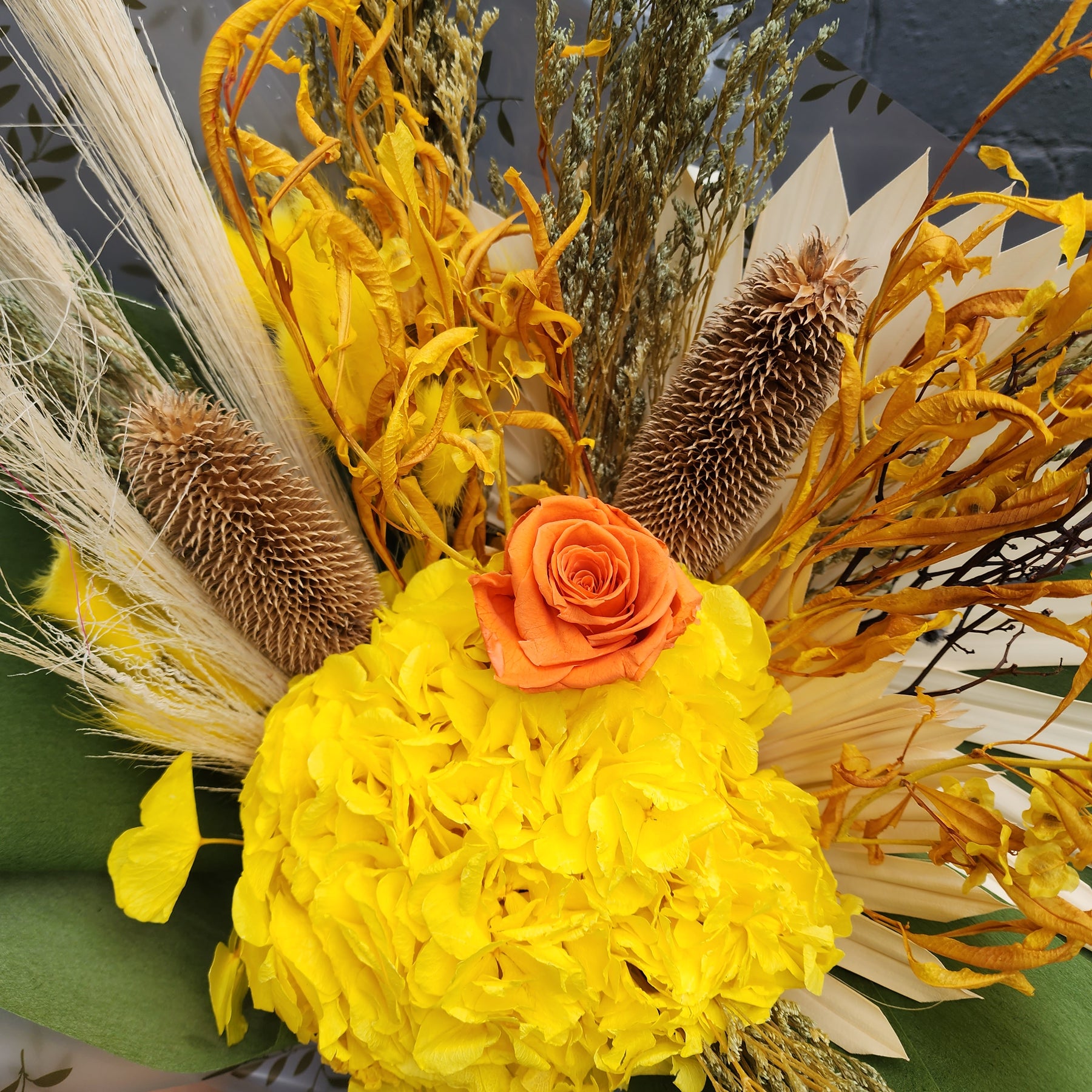 This arrangement features a distinctive mix of dried and preserved botanicals such as hydrangeas, banksia, misty, and palm leaves, highlighted by a single preserved orange rose. The bouquet measures about 50 cm in height and 40 cm in diameter, including its wrapping. Each piece is crafted as a unique, one-of-a-kind creation.