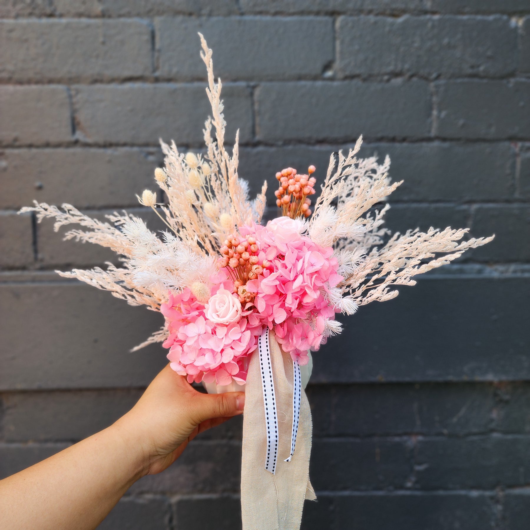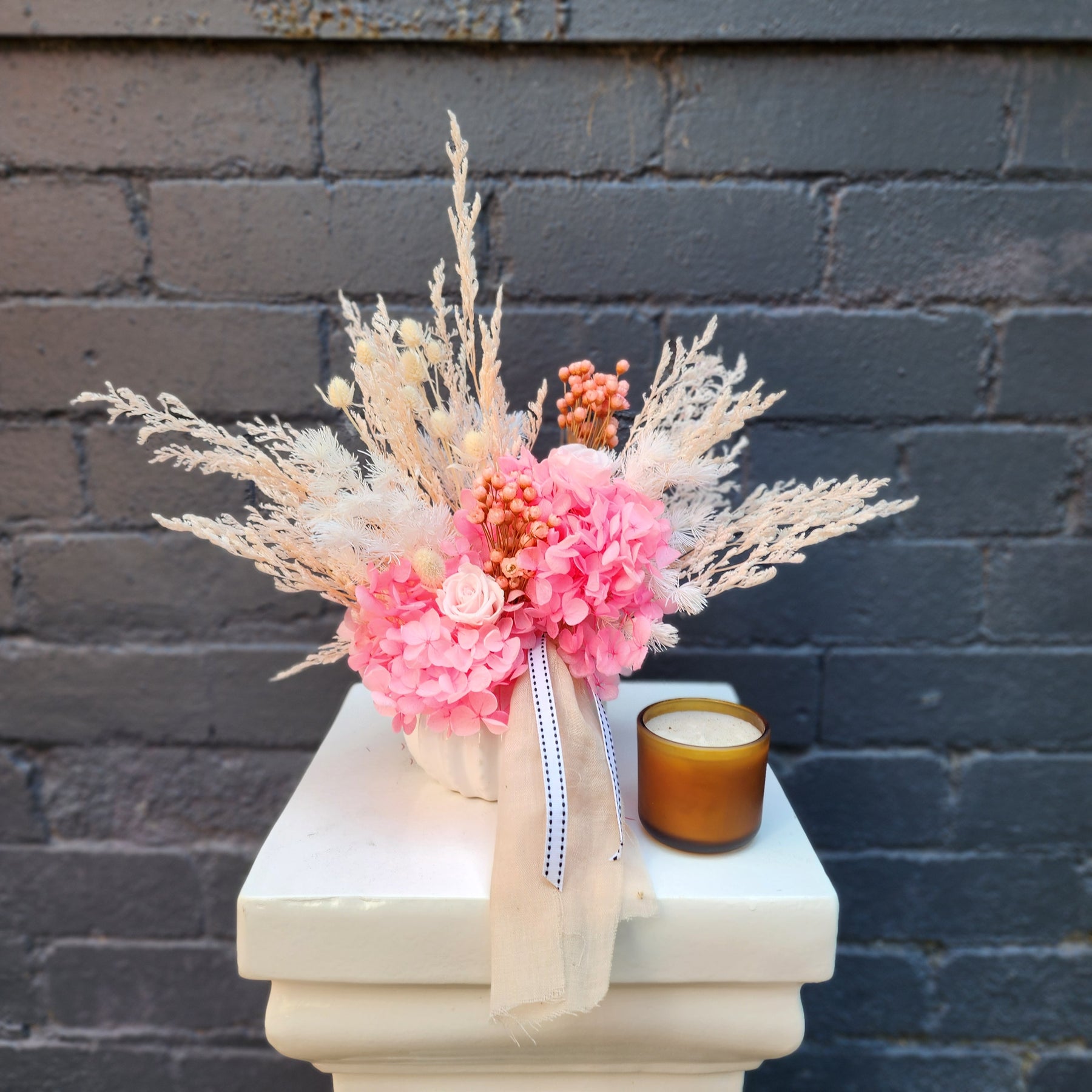 This arrangement is made with dried and preserved flowers in pink shades shades. You get what you see. Price inc Vase. Candle is for size reference only, not included. Overall dimension is approx. 30cm tall x 30cm wide, measured to the widest/tallest point.