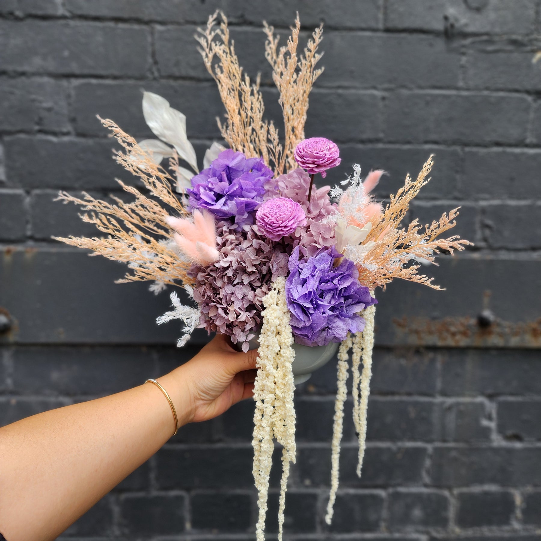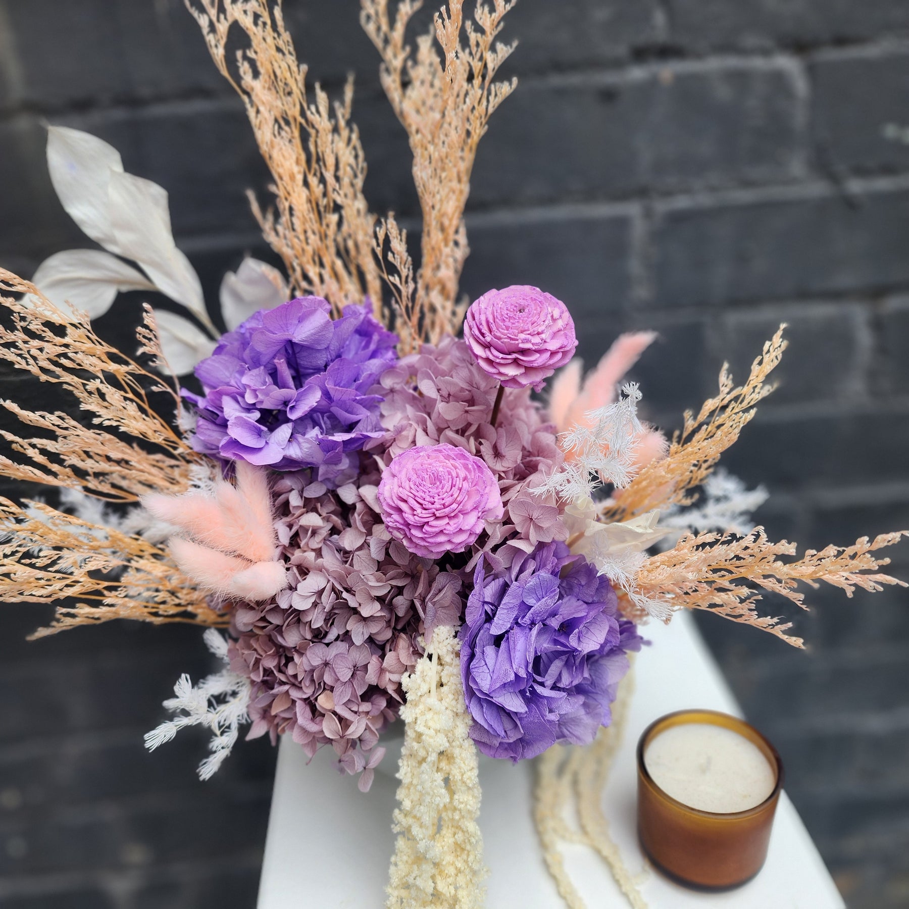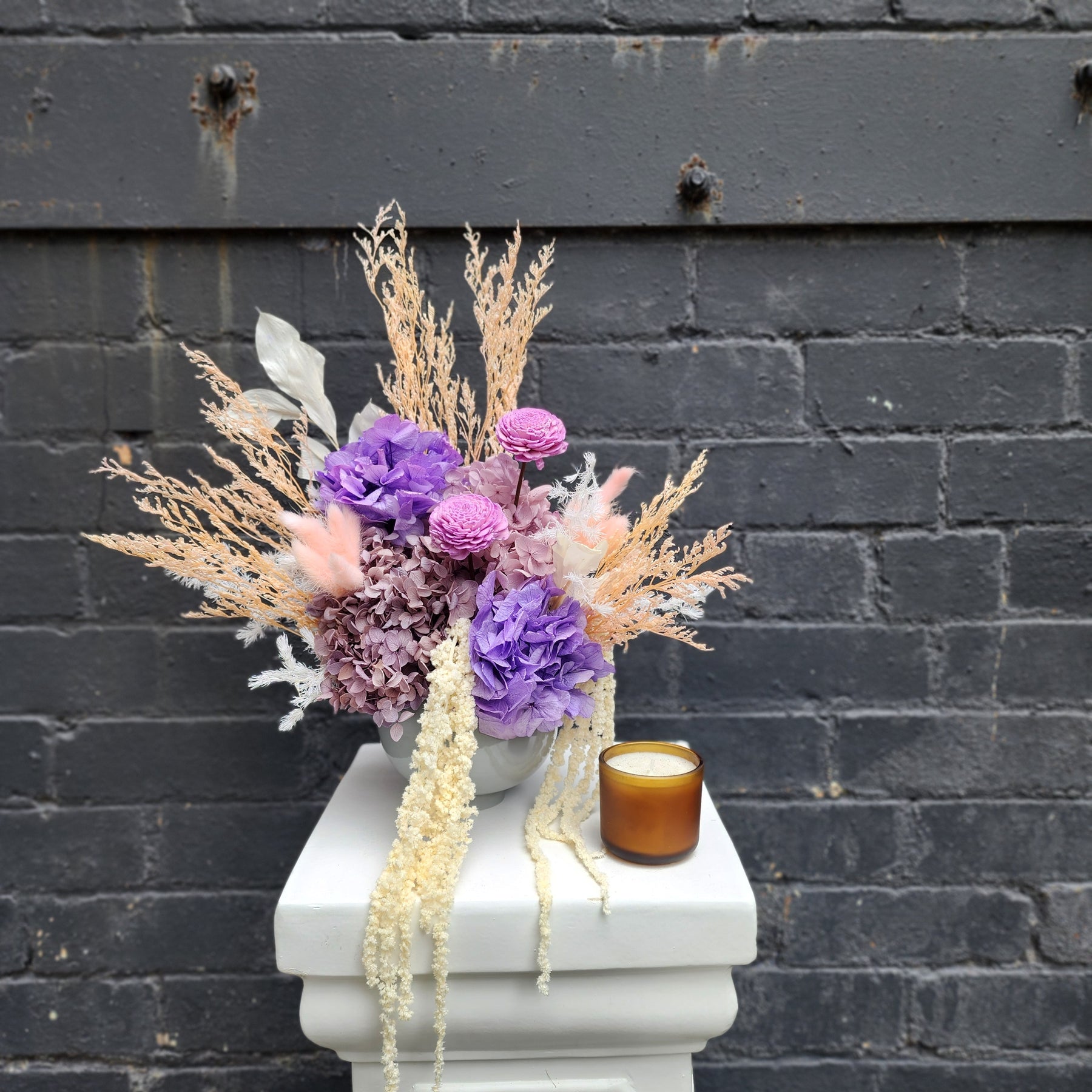 This one-of-a-kind arrangement features dried and preserved flowers in purple, pink and white tones. Presented in a sleek Urban Eden grey metal footed urn, this striking piece brings natural elegance to any space. Measuring approximately 40cm tall by 32cm wide at its fullest points, it's a statement-making display. The vase is included in the price. Please note: the candle shown is for scale reference only and is not included with your purchase.