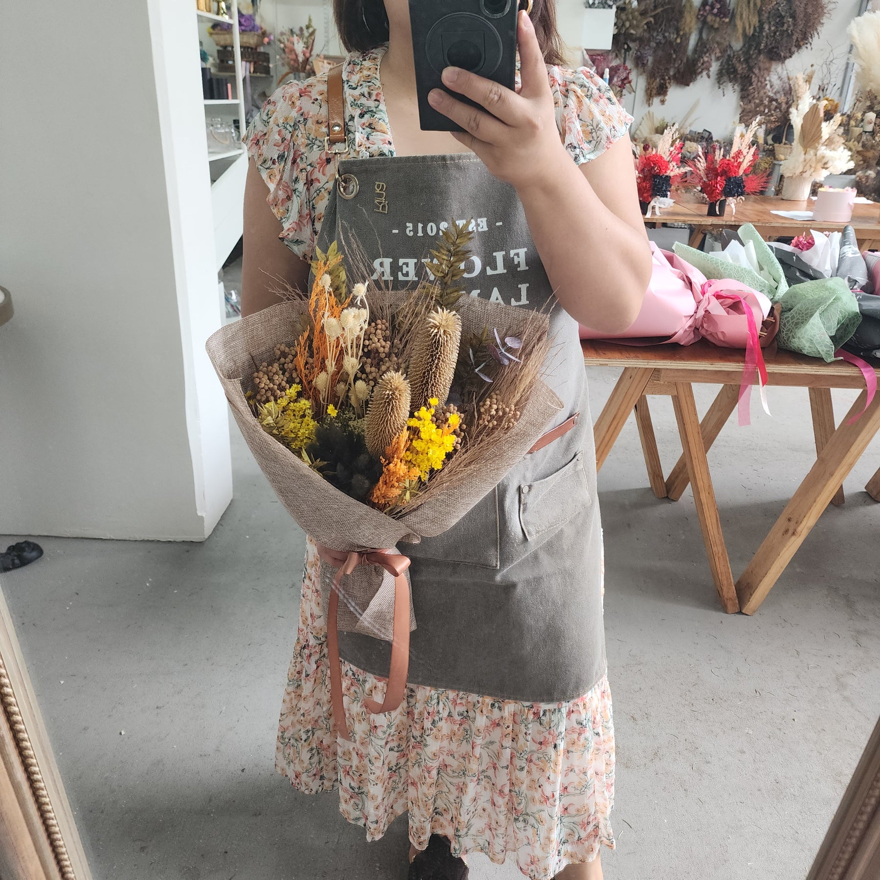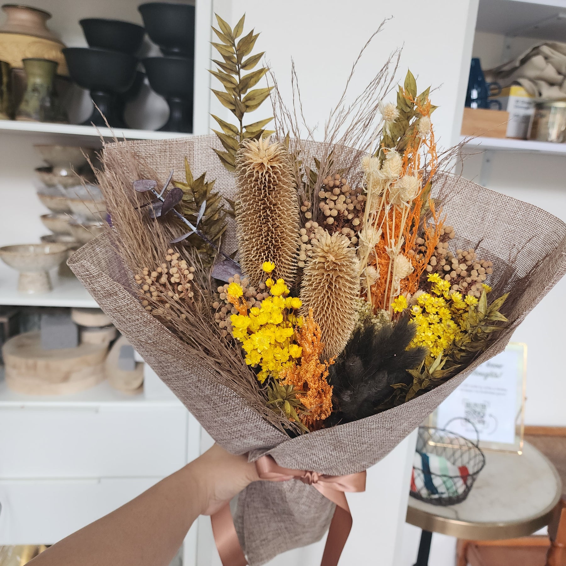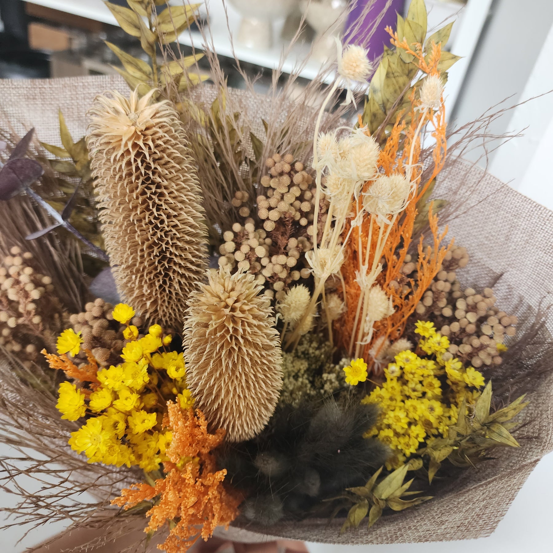 This arrangement features a distinctive mix of dried and preserved botanicals such as banksia, ltalian ruscus, gum leaves, yellow daisy and bunny tail. Each piece is crafted as a unique, one-of-a-kind creation.