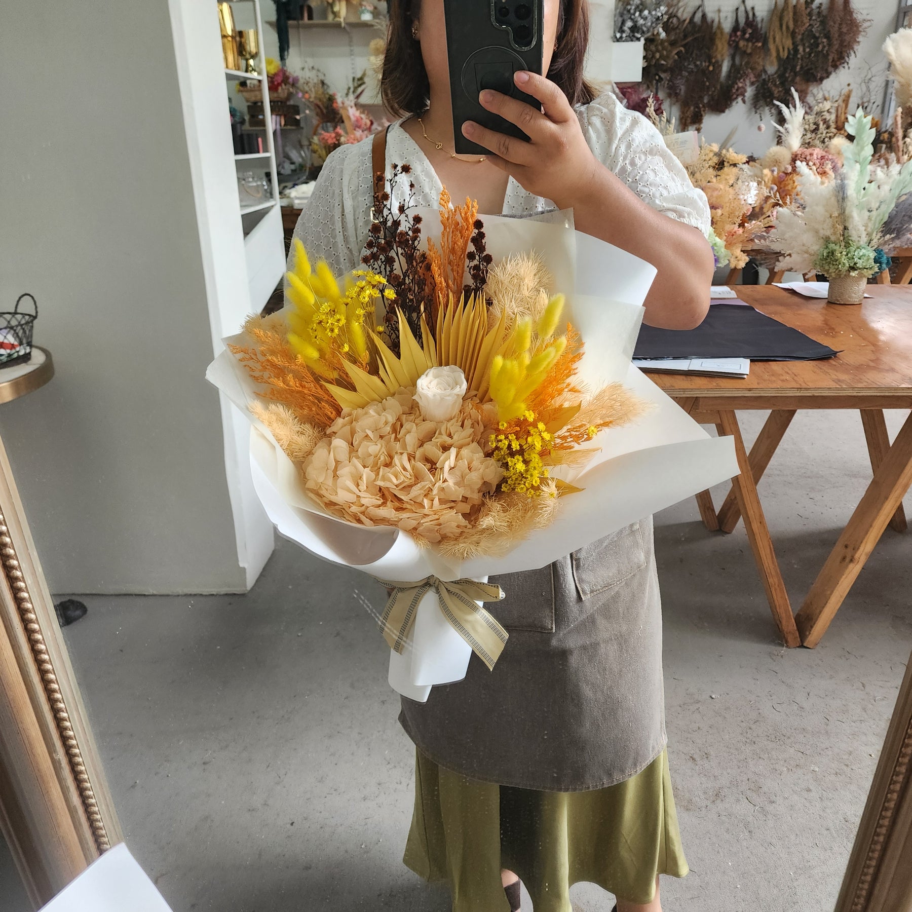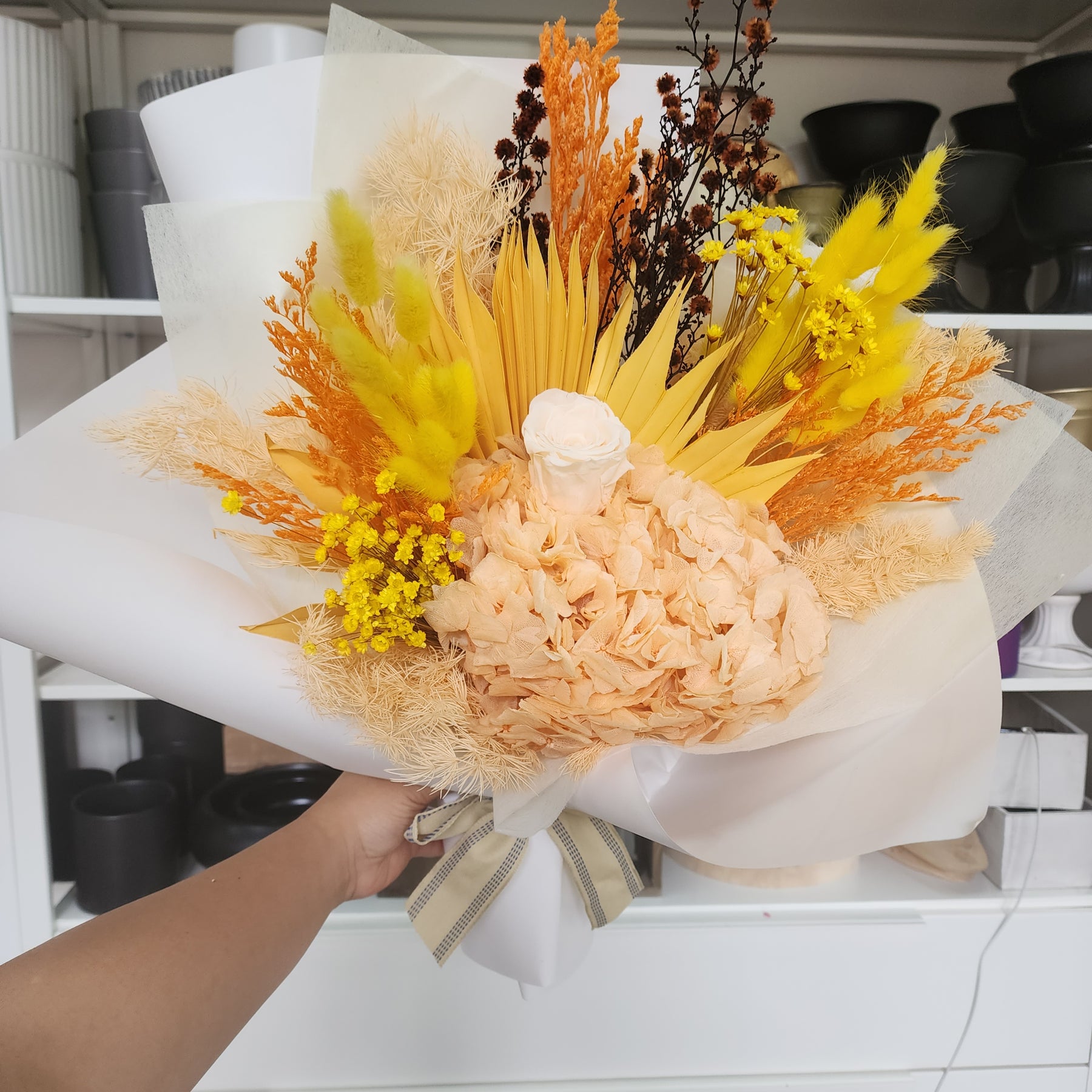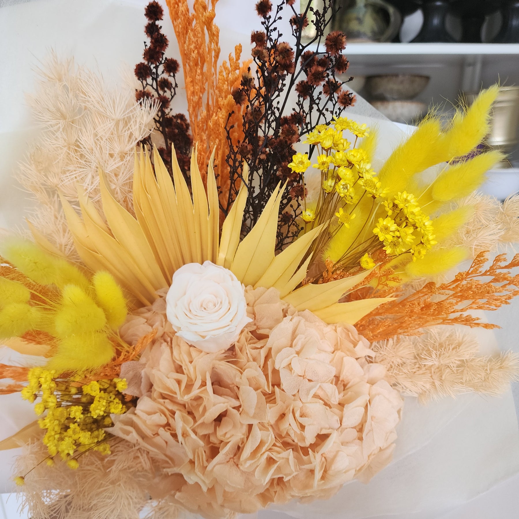 This arrangement features a distinctive mix of dried and preserved botanicals in peach, orange and yellow colour. Each piece is crafted as a unique, one-of-a-kind creation.