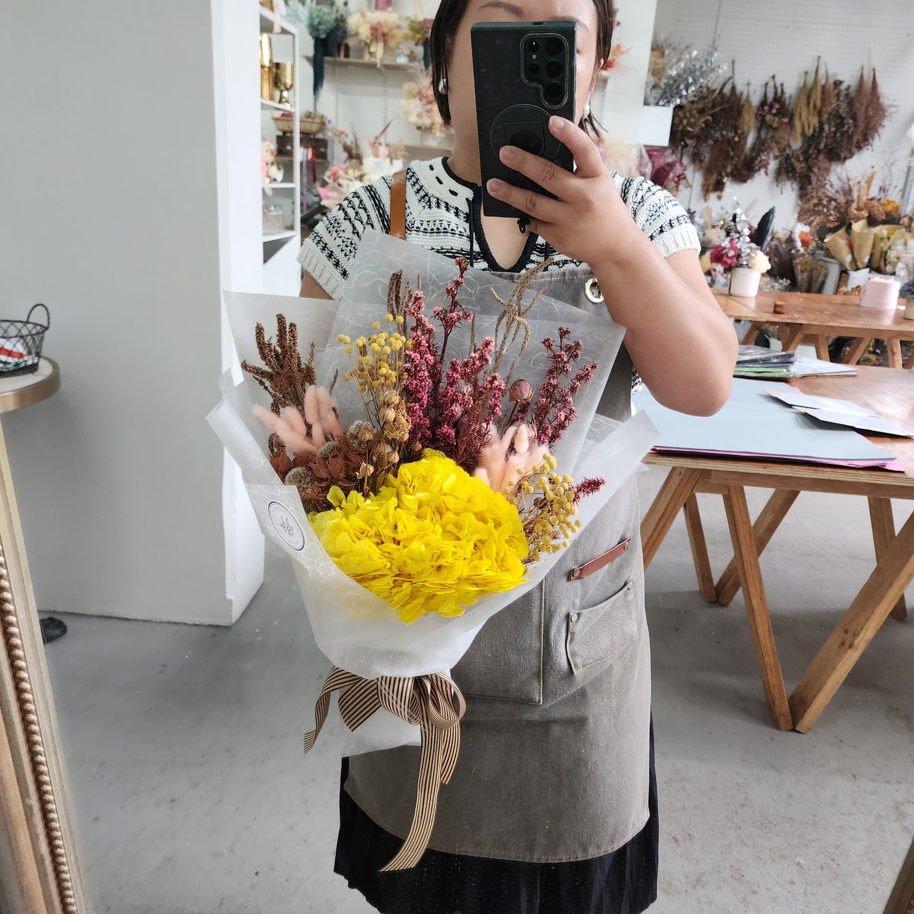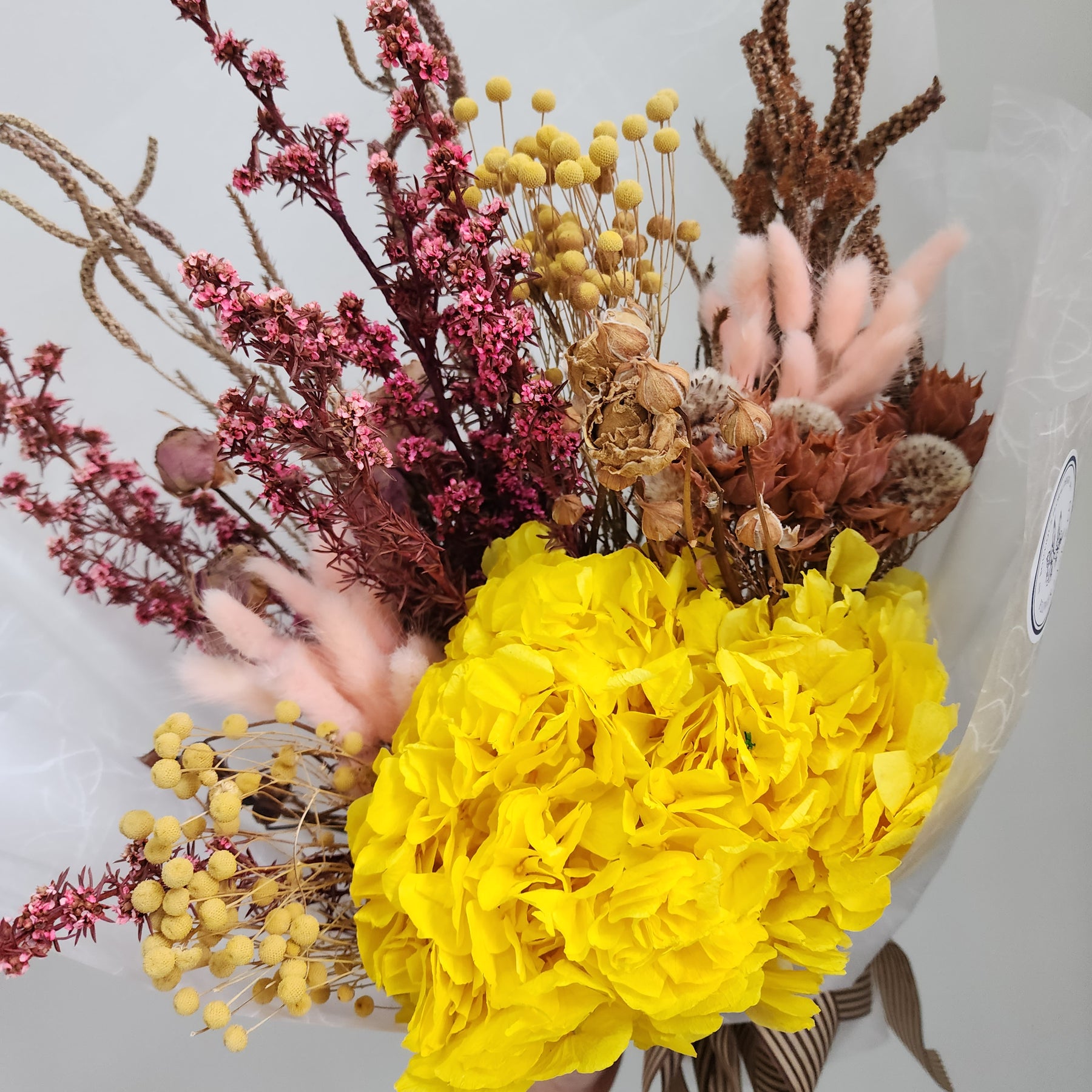 This arrangement features a distinctive mix of dried and preserved botanicals in yellow and pink. Each piece is crafted as a unique, one-of-a-kind creation.