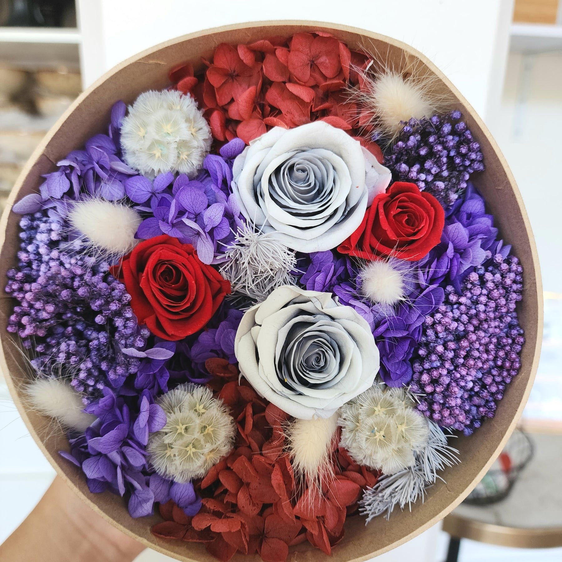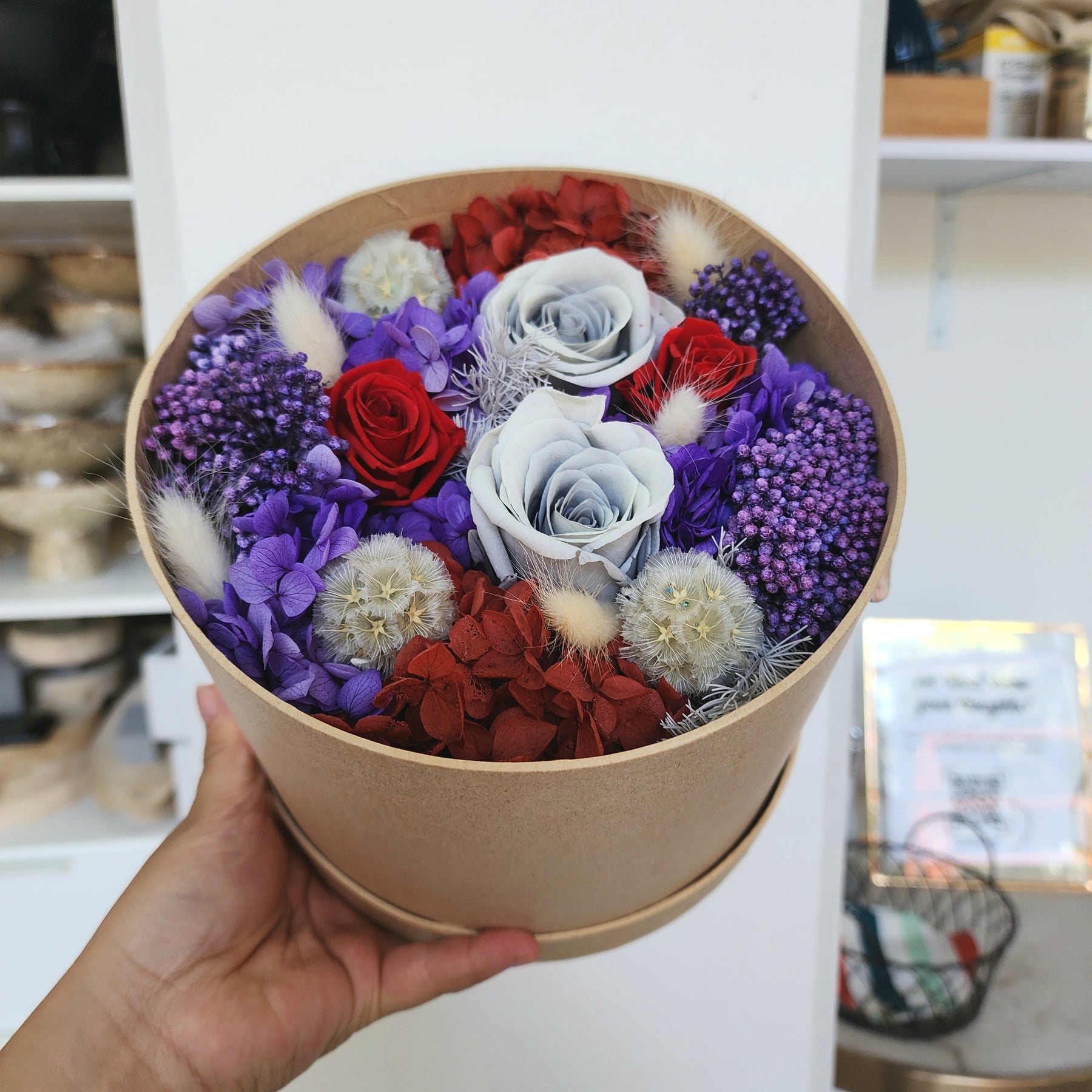 Everlasting arrangement made of preserved flowers in shades of purple and red, features with 2 light grey preserved roses and 2 red preserved mini roses. Large Hat Box size: 18.5 x 15cmH