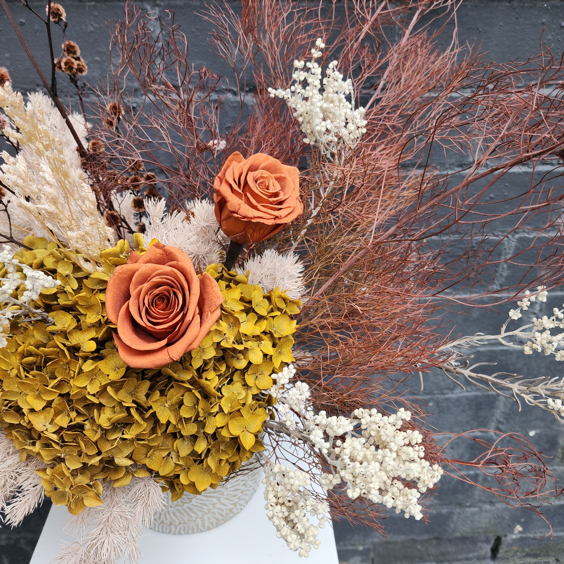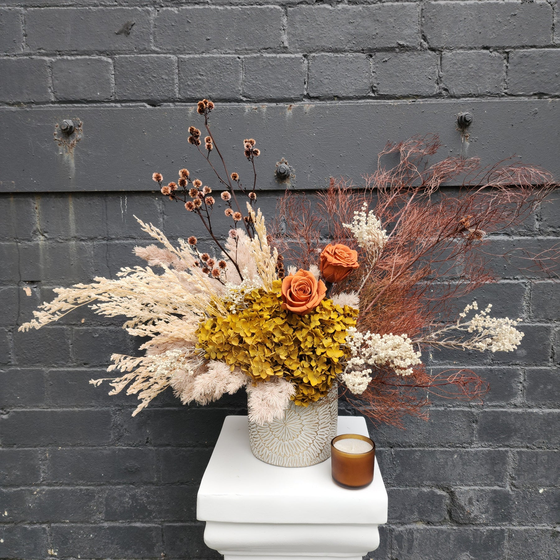 This arrangement is in a mix of warm tone - brown, mustard yellow, white and cream, feaured with vintage orange preserved rose. Price inc Vase . Front facing design. Candle is for size reference only, not included. Image 1-3 is size medium. See second last image for size comparison. See last image for vase used in different sizes.